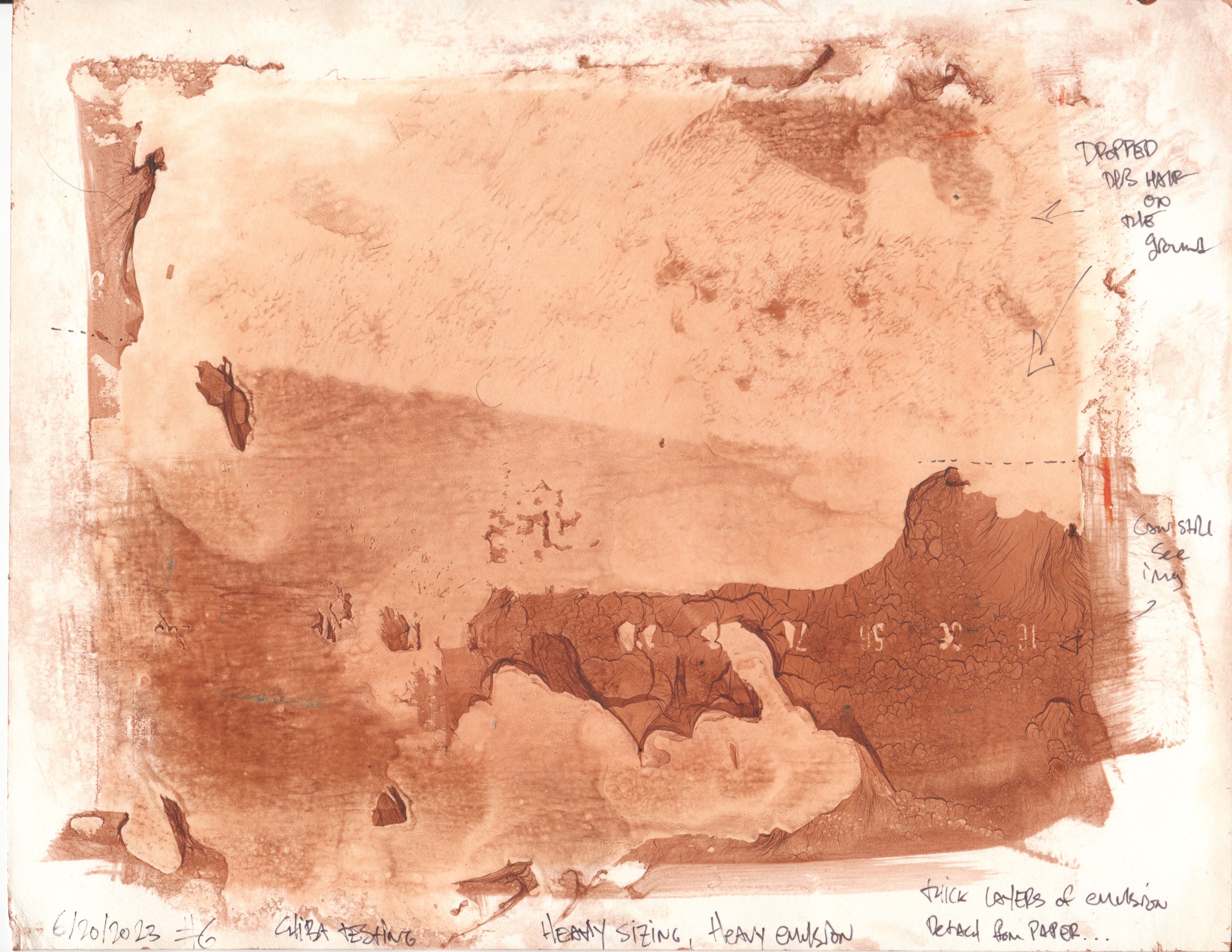 Testing to see how things behave with heavy amounts of sizing. was tough to spread onto paper, quite gloopy. used elmers school glue directly, had to use some of the lighter pva to wet things and get things to spread. not a great process id say. see Chiba 6-20-2023 - 7
